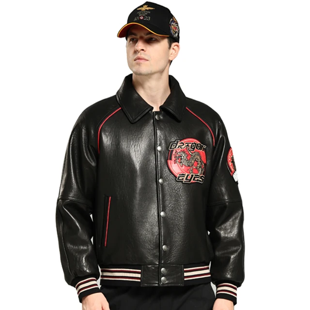 Winter 2022 New Men's Wool Embroidered Flight Jacket Black Sheepskin Shearling Leather Jacket